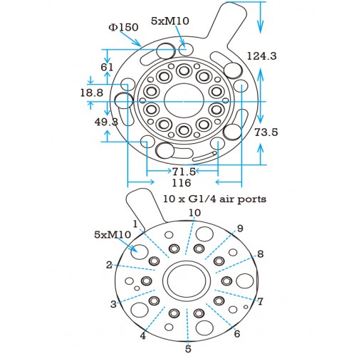 10xG1/8 air ports 5xM6 or 5xM8 blots tapping into EOAT base plate