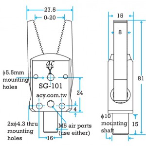Standard 10mm diameter mounting post with M5 air port. Another M5 air port on front of gripper can be used
