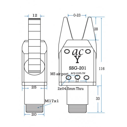 Standard 20mm diameter mounting post with M5 air port. Another M5 air port on front of gripper can be